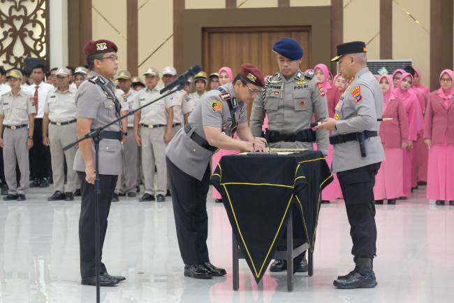 Direktur Pamobvit Polda Kalsel, Kombes Pol Agus Setiawan, menyerahkan jabatan kepada Kombes Pol Sukron. Kapolres Tapin, AKBP Jimmy Kurniawan menyerahkan tongkat estafet kepemimpinan kepada AKBP Weldi Rozika.