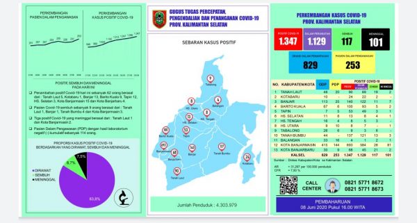SuarIndonesia – Kasus covid di Kalsel berjumlah 1.347 terdiri dari 1.129 dalam perawatan, 117 sembuh, dan 101 meninggal dunia, Senin (8/6/2020).