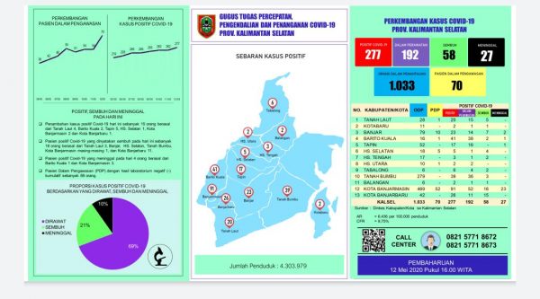 “ODP tercatat 1.033, sedangkan PDP 70 orang dari sebelumnya 58. Penambahan PDP terdiri 23 PDP baru 23, terdapat 3 PDP negatid, dan ada PDP kemarin meninggal,” kata Juru Bicara Gugus Tugas Percepatan Penanganan Covid-19 Kalsel, HM Muslim.