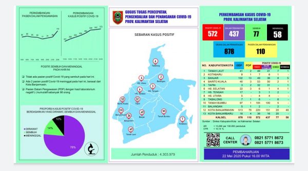 SuarIndonesia – Saat ini tercatat Orang Dalam Pantauan (ODP) 878, Pasien Dalam Perawatan (PDP) 110, dan kasus terkonfirmasi positif terjadi penambahan 21 kasus. Jumlah kasus 572 terdiri dari 437 dalam perawatan, 58 meninggal, dan 77 sembuh.
