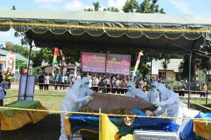 Rombongan juga menyaksikan simulasi pemulasaraan jenazah Covid 19, yang di peragakan para relawan KTB Desa Tirta Jaya, yang telah di latih Dinas Kesehatan Tala bersinergi dengan Polres Tala, Kodim 1009 Pelaihari serta BPBD Tala.