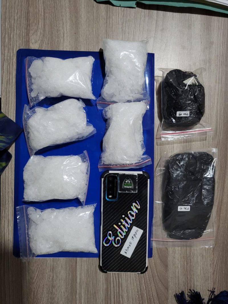 Adapun total barang bukti yang di sita petugas 6 paket sabu-sabu seberat 601,02 gram serta barang bukti lainnya.