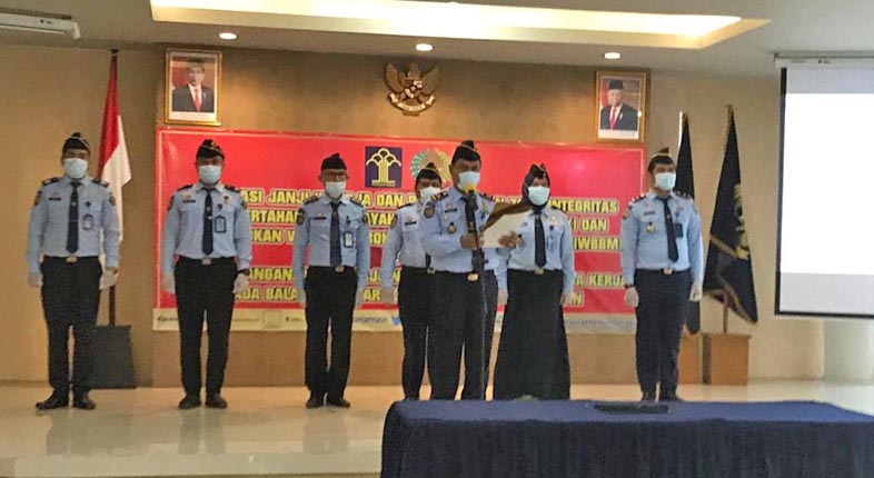Di hadapan Kepala Kantor Wilayah Kementerian Hukum dan Hak Asasi Manusia (Kemenkumham) Kalimantan Selatan Tejo Herwanto, Kepala Bapas Kelas I Banjarmasin Bagus Kurniawan membacakan deklarasi yang diikuti seluruh jajarannya.