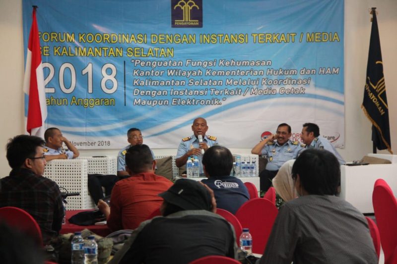 Suarindonesia – Kanwil Kementerian Hukum dan HAM (Kemenkumham) Kalimantan Selatan menggelar penguatan fungsi kehumasab, Senin (05/11/2018), bertempat di Fizz Room Hotel POP Banjarmasin. Sebanyak 35 wartawan cetak dan elektronik se Kalsel mengikuti forum koordinasi dengan instansi terkait/media.
