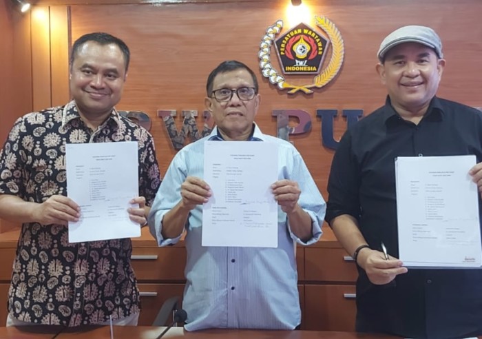 SuarIndonesia – Hendry Ch Bangun, Ketua Umum PWI Pusat yang terpilih Kongres Persatuan Wartawan Indonesia ke XXV di Bandung di damping H. Zulmansyah Sekedang dan Farianda Putra Sinik menyampaikan Susunan Pengurus Pusat PWI Periode 2023-2028, di Sekretariat PWI Pusat, Gedung Dewan Pers, Kebon Sirih Jakarta, Sabtu (7/10/2023).