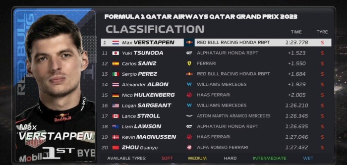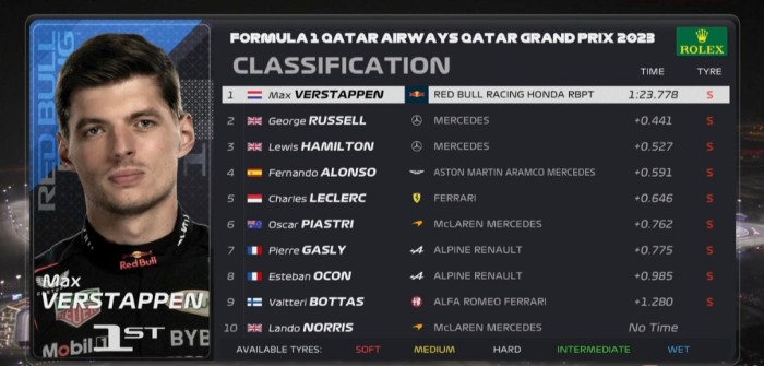 SuarIndonesia — Max Verstappen meraih pole position F1 GP Qatar di Sirkuit Losail, Sabtu (7/10/2023) malam WIB, sementara waktu putaran kedua pebalap McLaren dihapus setelah sesi.