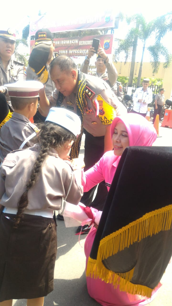 Kunjungan kerja itu didampingi Ketua Bhayangkari Ny Rinny Yazid Fanani juga disambut dengan rangkaian bunga dan selendang sasirangan yang diserahkan oleh dua anak TK.