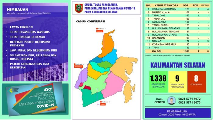 SuarIndonesia – Berdasarkan rilis data Gugus Tugas P3 Covid-19 Kalsel, Kamis (2/4.2020) pukul 16.00 WITA, jumlah pasien terkonfirmasi positif 8 orang.
