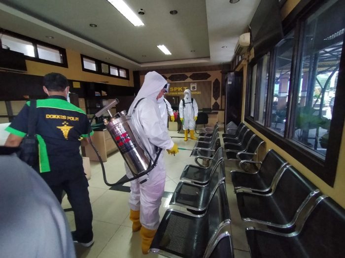 SuarIndonesia – Markas Kepolisian Daerah Kalimantan Selatan (Mapolda Kalsel) disterilkan mencegah kemungkinan penularan Virus Corona atau Covid-19, Minggu (15/3/2020).