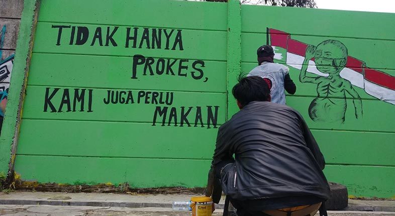 Di sampingnya, terpampang kalimat ‘TIDAK HANYA PROKES, KAMI JUGA PERLU MAKAN’ yang ditulis dengan cat akrilik hitam dengan latar cat warna hijau tosca.