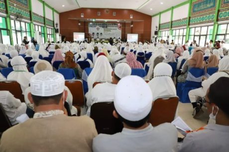 SuarIndonesia – Jemaah calon haji (JCH) Kalsel tahun 2022 mengikuti manasik haji di Asrama Haji Embarkasi Banjarmasin, Kamis (9/6/2022).