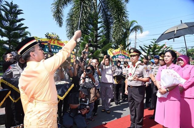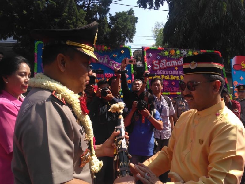 Suarindonesia – Penyambutan Kepala Polisi Daerah Provinsi Kalimantan Selatan, Irjen Pol Drs. Yazid Fanani M.si diwarnai dengan upacara khas adat kebudayaan Banjar oleh tokoh masyarakat Kalimantan Selatan, Sultan Banjar Sultan Khairul Saleh Al-Mu’tashim Billah di Markas Polisi Daerah Kalimantan Selatan, Sabtu (8/9/2018).