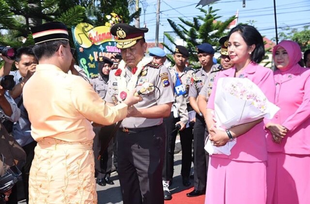 Dengan mengenakan pakaian adat Banjar, Sultan Banjar Sultan Khairul Saleh Al-Mu’tashim Billah menyambut kapolda yang berjalan di atas karpet berwarna merah.
