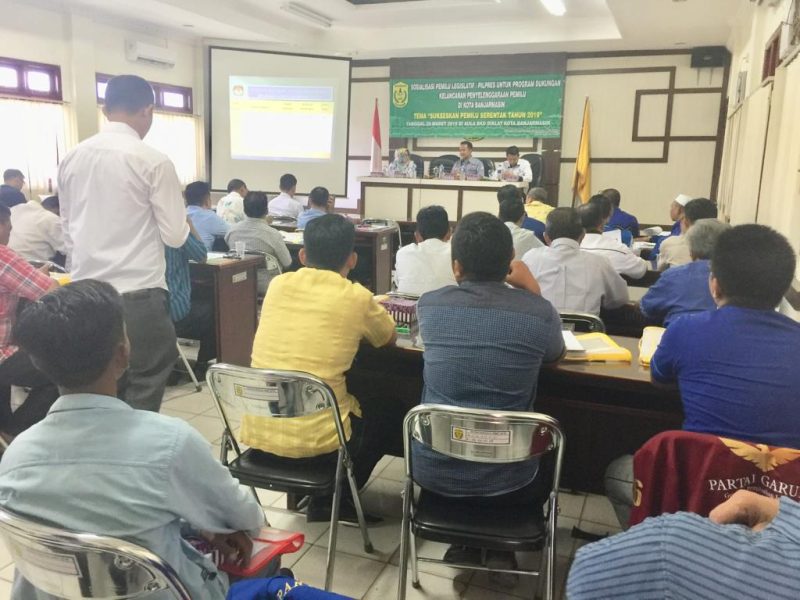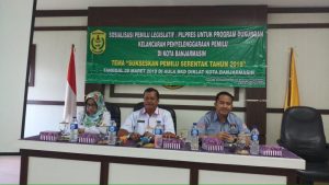 Kegiatan Sosialisasi yang diselenggarakan Kesbangpol Kota Banjarmasin, Aula BKD Diklat Jalan Hasan Basry Banjarmasin, dibuka Kepala Kesabangpol Kota Banjarmasin Drs HM Kasman juga menghadirkan nara sumber selain Banwaslu, dqn dari KPU Kota Banjarmasin Gusti Makmur.