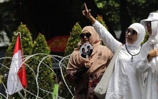 Sejak melakukan aksi jalan kaki (long march) dari Masjid Sunda Kelapa, sebagian massa aksi baik perempuan maupun laki-laki mengacungkan jempol dan telunjuknya.