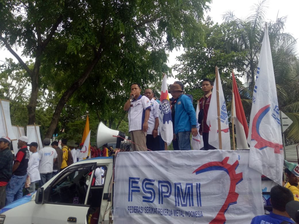 SuarIndonesia – Massa dari Federasi Serikat Pekerja Metal Indonesia (FSPMI) Kalsel dengan komando Nyoeyoen Indarto dan Aliansi BEM Kalsel, dikomando M Gulam R melakukan aksi demo di DPRD Kalsel, Kamis (28/11) menuntut atas kenaikan BPJS dan upah murah,Selain itu tolak tenaga kerja asing.
