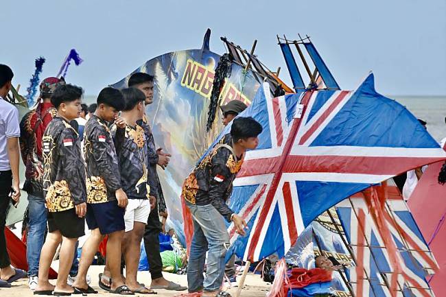 Sesaat setelah festival dibuka, ratusan peserta dari berbagai komunitas layangan unjuk kebolehan. Mereka yang terdiri atas beberapa orang dalam satu kelompok membagi tugas masing-masing. Dua hingga empat orang memegang layangan raksasa itu dekat di bibir pantai, beberapa orang lainnya menggenggam erat tali dan berlari kompak sekencang mungkin dengan aba-aba sambil menjauhi bibir pantai.