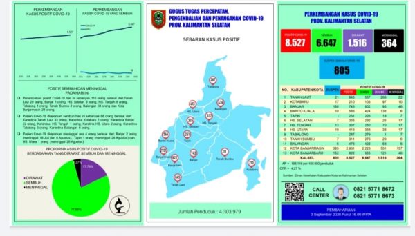 Keseluruhan kasus covid di Kalsel berjumlah 8.527 terdiri dari 6.647 sembuh, 1.516 dalam perawatan, 364 meninggal.(RW)