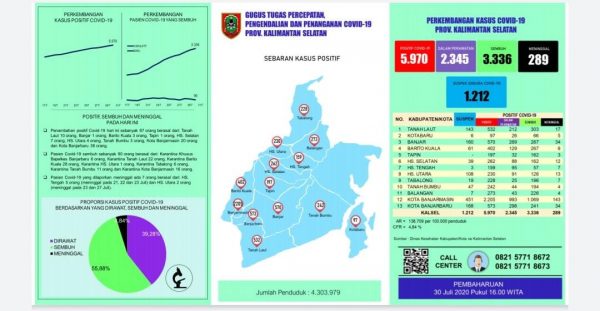 Secara keseluruhan kasus covid-19 di Kalsel berjumlah 5.970 terdiri dari 2.345 dalam perawatan, 3.336 sembuh, dan 289 meninggal dunia.