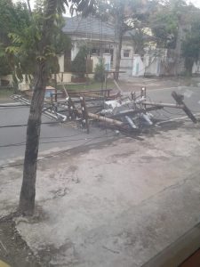 Bahkan dari keterangan warga, dengan ambruknya tiang penopang trafo itu sempat mengeluarkan bunyi ledakan dan kabel pada putus.