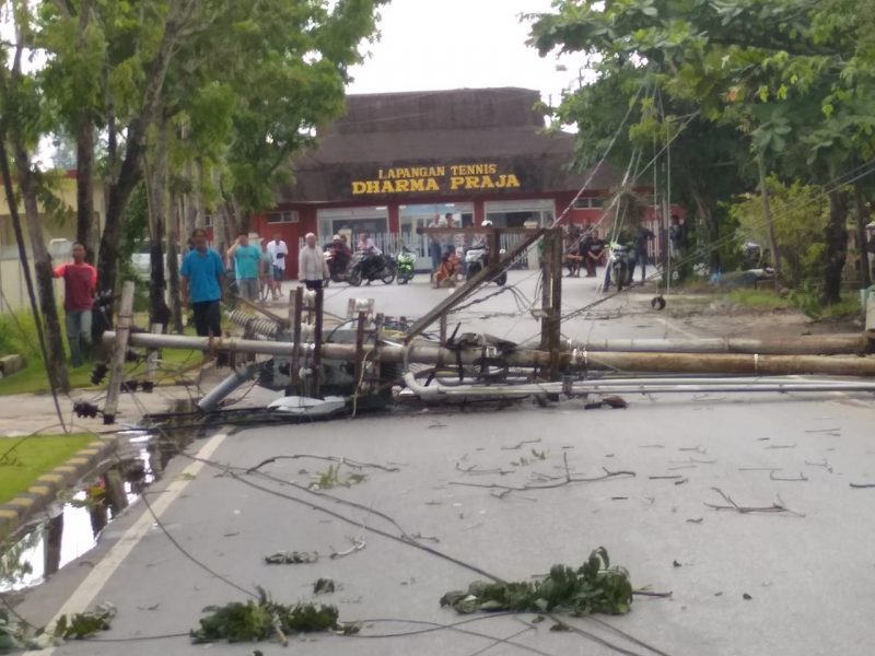 Suarindonesia – MENGERIKAN – Dua tiang listrik penopang Transformator (trafo) di kawasan Kompleks Dharma Praja, tak jauh dari rumah dinas Ketua DPRD Kalsel, Sekdaprov dan rumah dinas Walikota Banjarmasin ini, tumbang, Sabtu (5/1) siang, sekitar pukul 13.19 WITA.