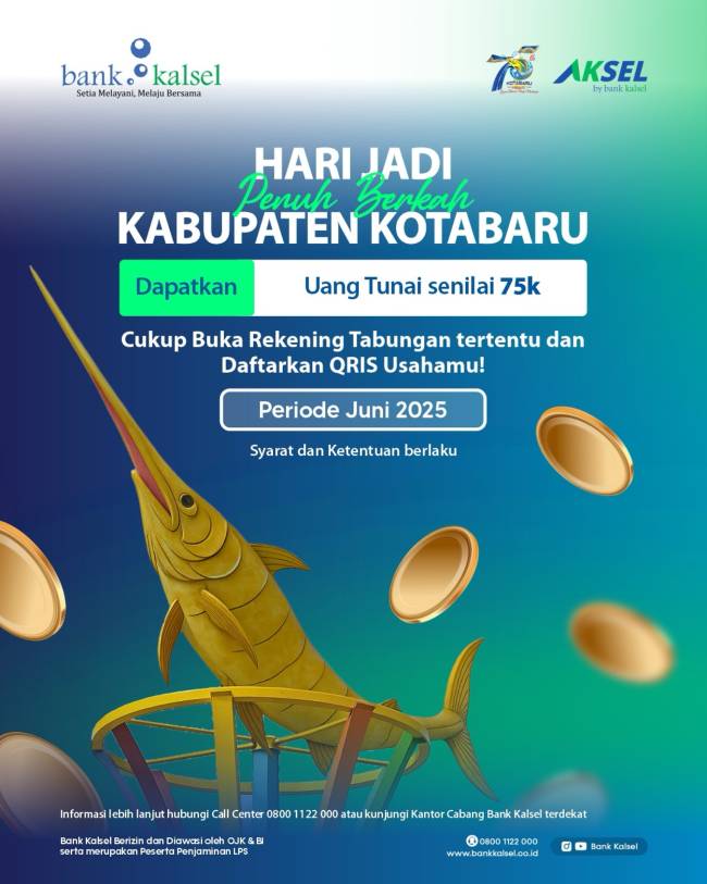 Dengan promo ini, Bank Kalsel menunjukkan komitmennya dalam mendukung dan merayakan hari jadi Kabupaten Kotabaru ke-75. Jadi, jangan sampai terlewatkan kesempatan ini untuk mendapatkan uang tunai senilai Rp 75.000.(ADV/SU)