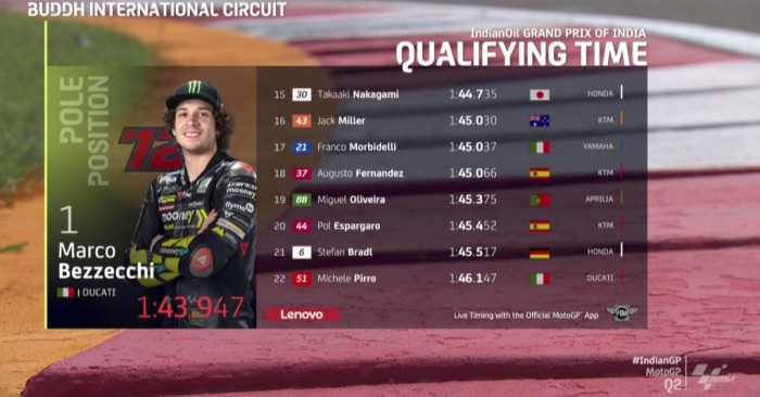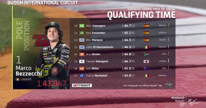 SuarIndonesia — Hasil kualifikasi MotoGP India 2023 memunculkan Marco Bezzecchi sebagai yang tercepat. Ia pun menjadi peraih pole position perdana dalam gelaran MotoGP India — sebuah pole bersejarah!