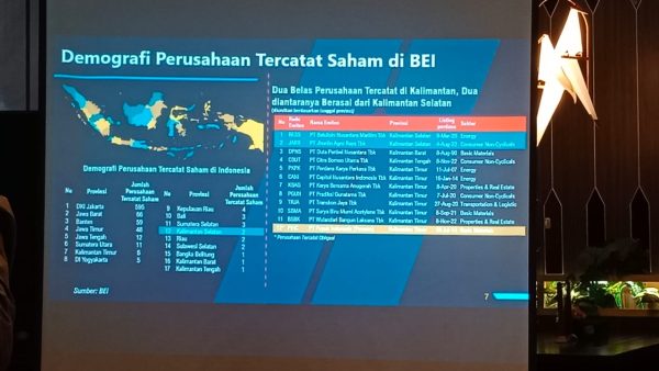 Sementara itu Direktur Penilaian Perusahaan PT Bursa Efek Indonesia I Gede Nyoman Yetna menjelaskan Demografi perusahaan yang tercatat di BEI untuk Kalimantan 12 perusahaan namun yang berasal dari Kalsel hanya dua perusahaan.