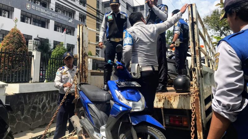 SuarIndonesia – Penertiban parkir liar kembali digalakkan pada kawasan Jalan Simpang Ulin Senin (6/1). Sebanyak 7 buah kendaraan roda dua diangkut personil Dinas Perhubungan (Dishub) Banjarmasin.