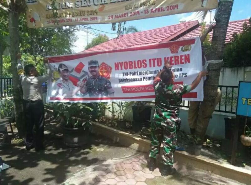 Banner dengan gambar Panglima TNI Marsekal TNI Hadi Tjahjanto, SIP bersama dengan Kapolri Jenderal Polisi Prof Drs. H Muhammad Tito Karnavian, M.A.,P.hD berjabat tangan komando yang bertulisan ‘TNI – POLRI BENTENG NKRI, Gunakan Hak Pilih Anda di Pileg 2019 dan Pilpres 2019, NYOBLOS ITU KEREN, TNI – Polri Menjamin Keamanan Pelaksanaan Pemilu hingga Ke TPS.