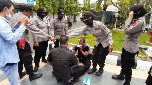 Mereka terluka saat menghalau para mahasiswa yang mencoba mendesak masuk ke gedung DPRD Provinsi Kalimantan Selatan. Kamis (24/6/2021).