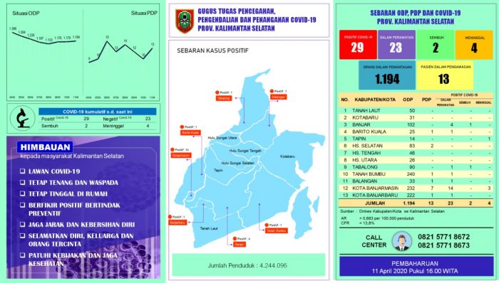 Ditambahkan Muslim tidak ada perubahan jumlah pasien terkonfirmasi positif, yaitu 29 orang terdiri dari 2 sembuh, 4 meninggal, dan 23 dirawat baik di rumah sakit maupun isolasi mandiri di rumah.