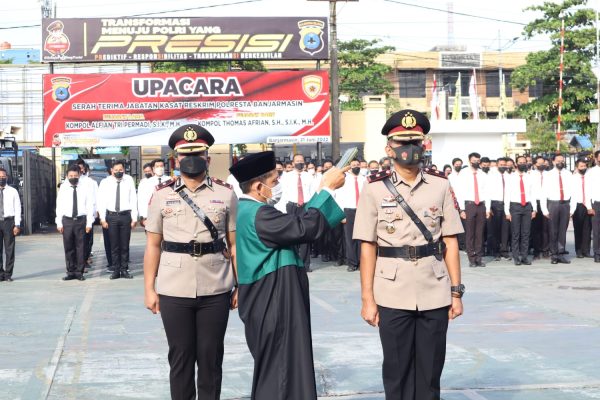 Serah terima jabatan (Sertijab) dan pengambilan sumpah dipimpin Kapolresta Banjarmasin Kombes Pol Sabana A Martosumito, di halaman Mapolresta.