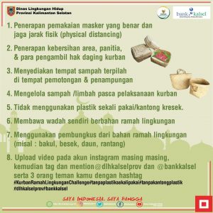 Salah satu langkah yang diambil dengan menggelar kompetisi penerapan ibadah kurban ramah lingkungan. Melalui media sosial DLH Kalsel telah mengumumkan kompetisi tersebut.