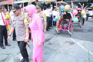 Setelah berjalan di bawah pedang pora, dilanjutkan satu persatu naik becak dengan didorong oleh komandan satuan masing- masing di mana personik ini bertugas.