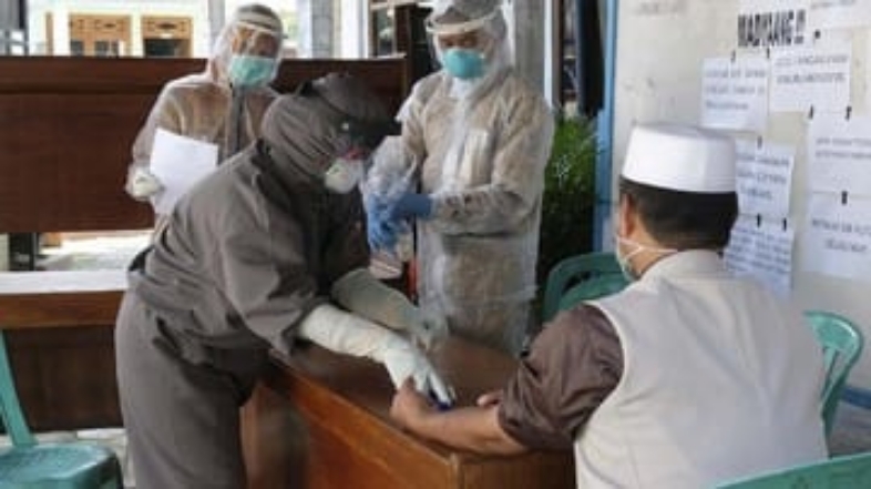 Petugas kesehatan melakukan rapid test untuk mengetahui risiko terinfeksi virus corona. (ANTARA FOTO/ANIS EFIZUDIN)