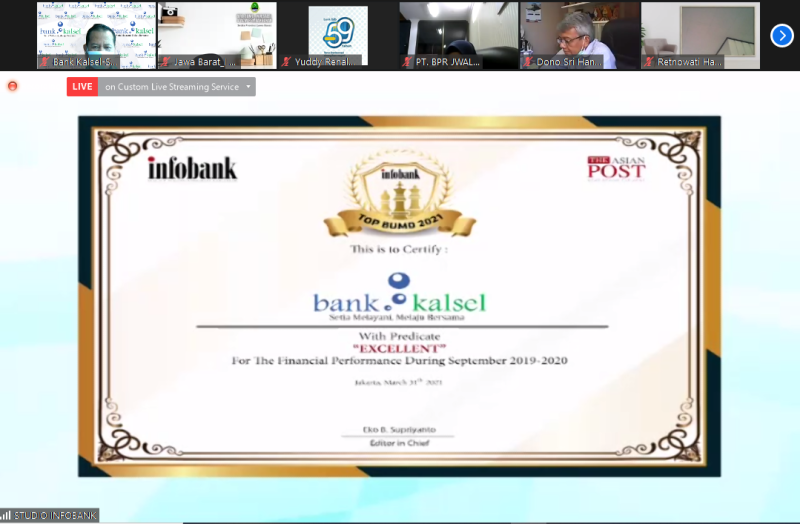 Penyerahan penghargaan ini dilaksanakan secara virtual yang dihadiri oleh Suriadi selaku Kepala Divisi Corporate Secretary, mewakili Direksi Bank Kalsel (31/3/2021).