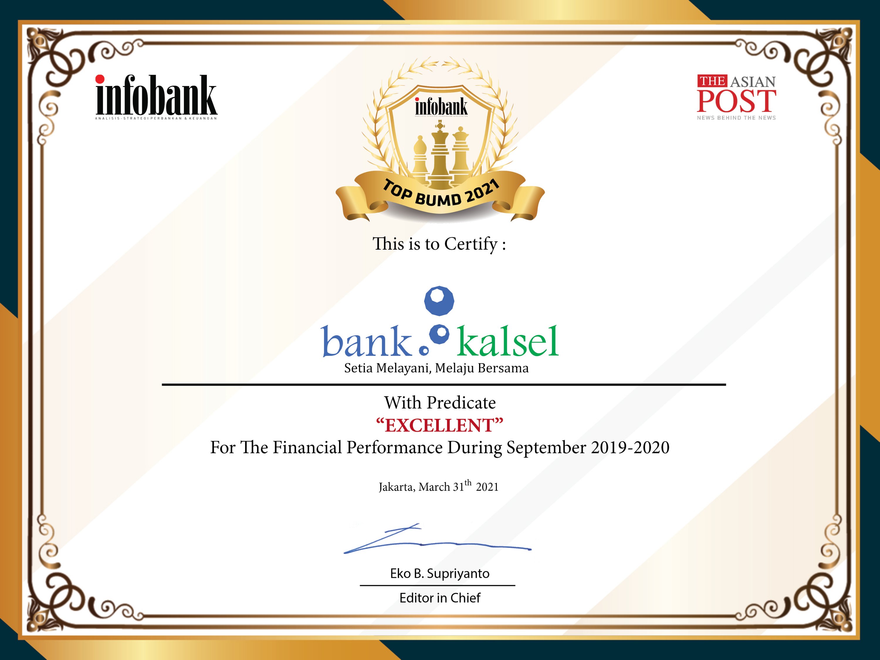 “Mewakili Direksi dan manajemen Bank Kalsel, kami mengucapkan terimakasih atas apresiasi yang diberikan oleh Infobank. Raihan yang sangat membanggakan ini sekaligus menjadi kado ulang tahun Bank Kalsel yang ke – 57.”