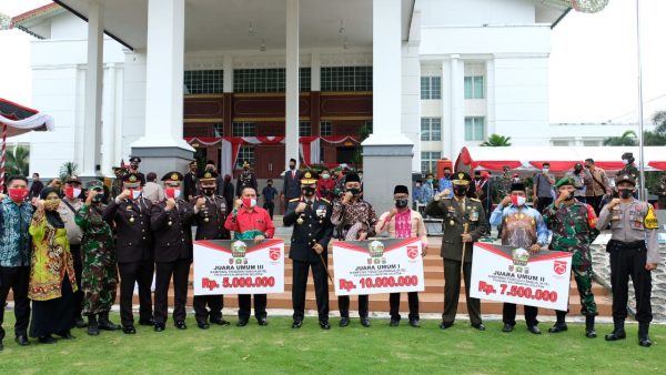 SuarIndonesia – Penghargaan untuk pemenang lomba KTB (Kampung Tanguh Banua) dan gerak jalan diserahkan di puncak HUT Kemerdekaan RI ke 75 Tahun 2020 berlangsung di lingkungan Kantor Setda Provinsi Kalsel, Senin (17/8/2020).