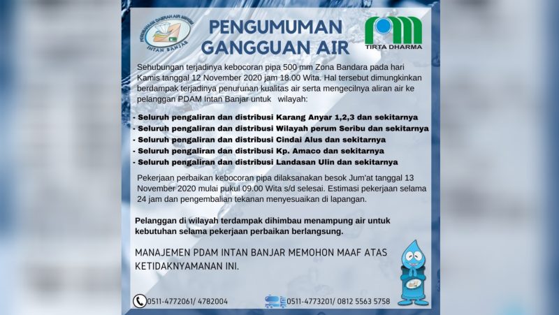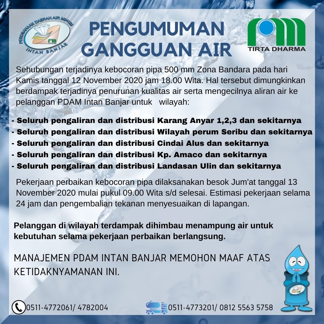 Sehubungan terjadinya kebocoran pipa 500 mm Zona Bandara pada hari kamis tanggal 12 November 2020 jam 18.00 Wita. Hal tersebut dimungkinkan berdampak tejadinya penurunan kualitas air serta mengecilnya aliran air ke pelanggan PDAM Intan Banjar untuk wilayah: