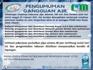 Sehubungan terjadinya kebocoran pipa diameter 500mm Zona Bandara pada hari Jum’at tanggal 5 Februari 2021. Hal tersebut dimungkinkan berdampak terjadinya penurunan kualitas air serta mengecilnya aliran air ke pelanggan PDAM Intan Banjar untuk wilayah: