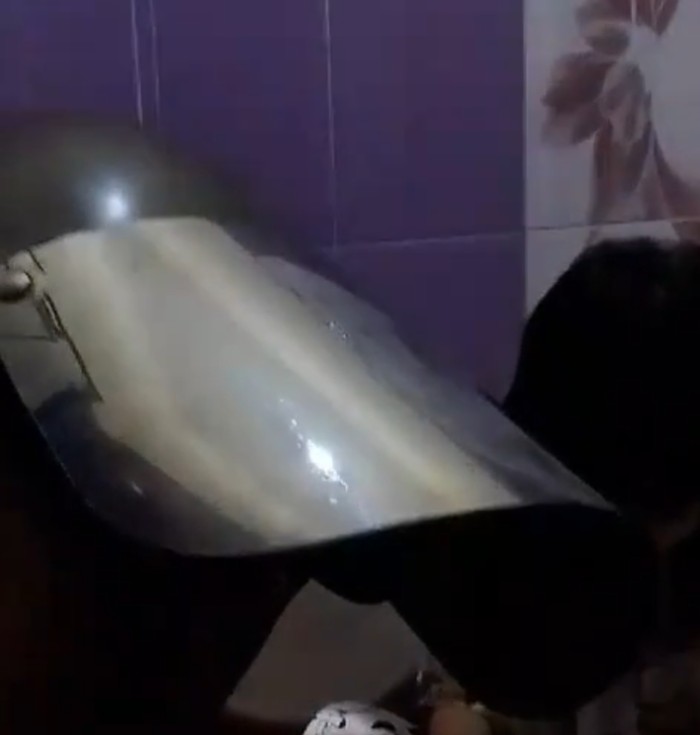 Video ini diunggah oleh akun Tiktok @honeyjeane yang memperlihatkakan seorang pria menggunakan helm bersama seorang bocah perempuan di dalam kamar mandi berwarna ungu.