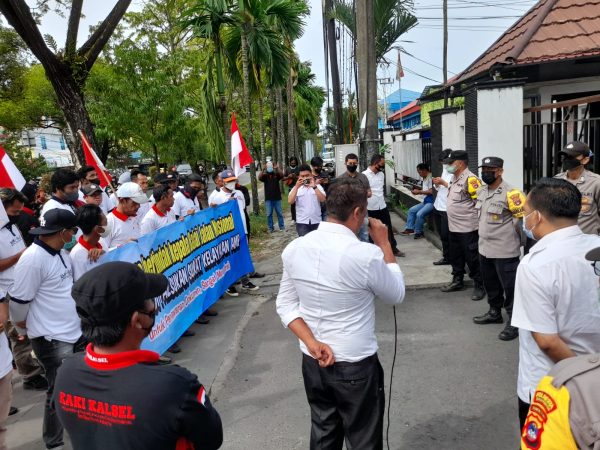 Aksi massa tergabung dalam Lembaga Swadaya Masyarakat (LSM) Komite Anti Korupsi Indonesia (KAKI) Kalsel melakukan di depan Kantor Kejati Kalsel di Jalan DI Pandjaitan Banjaramsin, Senin (1/8/2022).