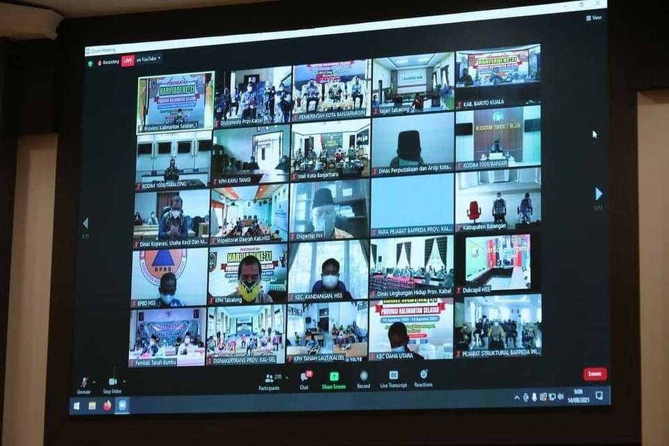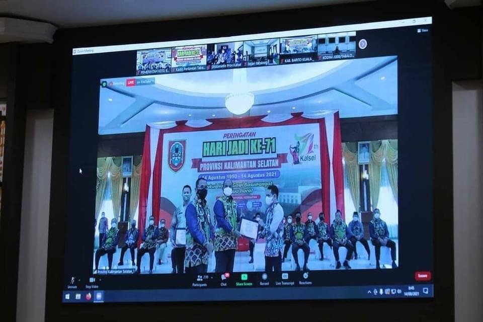 SuarIndonesia – Walikota Banjarmasin, H. Ibnu Sina beserta unsur Forkopimda Kota Banjarmasin mengikuti kegiatan Peringatan Hari Jadi Ke-71 Provinsi Kalimantan Selatan secara virtual yang bertempat di Aula Kayuh Baimbai, Balaikota Banjarmasin, Sabtu (14/08/2021).