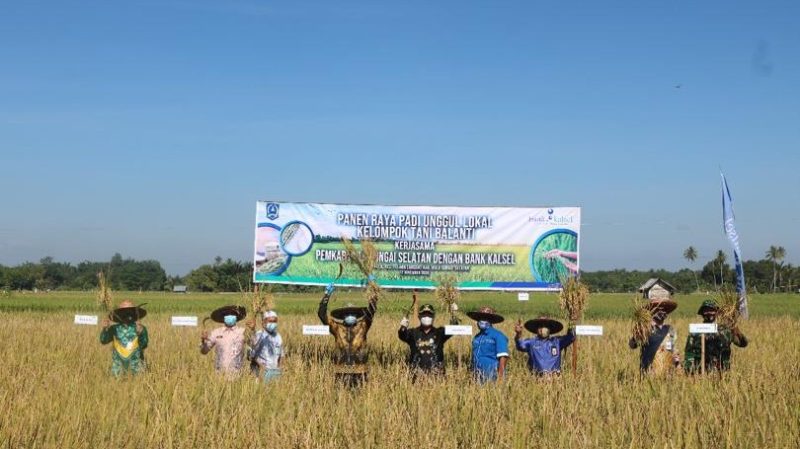 SuarIndonesia – Bentuk dukungan program ketahanan pangan daerah dalam pemulihan ekonomi nasional, Bank Kalsel menjalin sinergi dengan Pemerintah Kabupaten Hulu Sungai Selatan mengadakan Panen Raya Padi Unggul Lokal di Desa