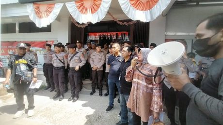 Massa AMKBPD (Aliansi Masyarakat Kota Banjarmasin Pejuang Demokrasi), saat aksi dikomando Eka Yuliansyah dan langsung disambut Ketua KPU Kota Banjarmasin, Rahmiyati Wahdah berserta jajaranya.