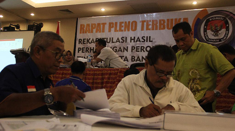 Pleno untuk menetapkan kembali hasil penghitungan di lima kecamatan, semua keberatan saksi dan catatan kejadian dibuatkan berita acara di Hotel G’Sign Banjarmasin, Minggu (5/5/2019) dinihari.
