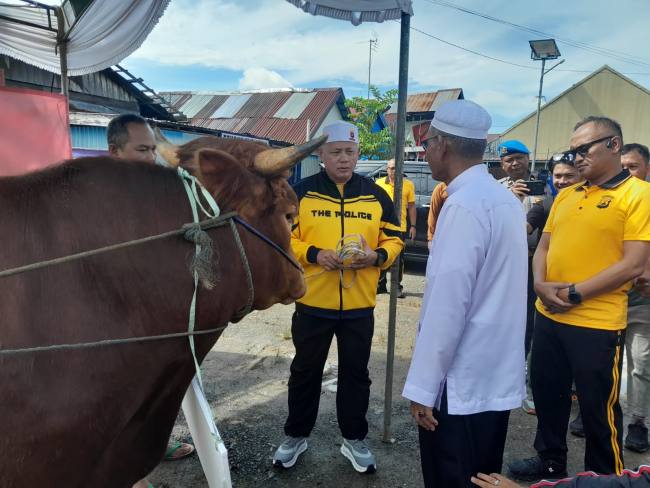 Dua ekor sapi jenis Limosin tersebut diserahkan langsung oleh Kapolda Kalsel Irjen Pol Rosyanto Yudha Hermawan bersama Kapolresta Banjarmasin Kombes Pol Cuncun Kurniadi kepada panitia haul.