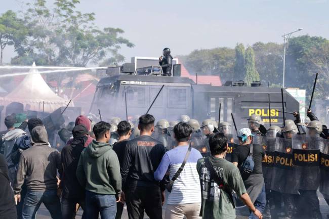 SuarIndonesia – Polisi terpaksa membubarkan massa dengan menyemprotkan air dengan menggunakan water canon.