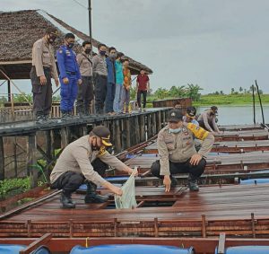 SuarIndonesia – Polisi dan warga secara bersama-sama melepas 8000 bibit ikan di Kampung Tangguh Banua.